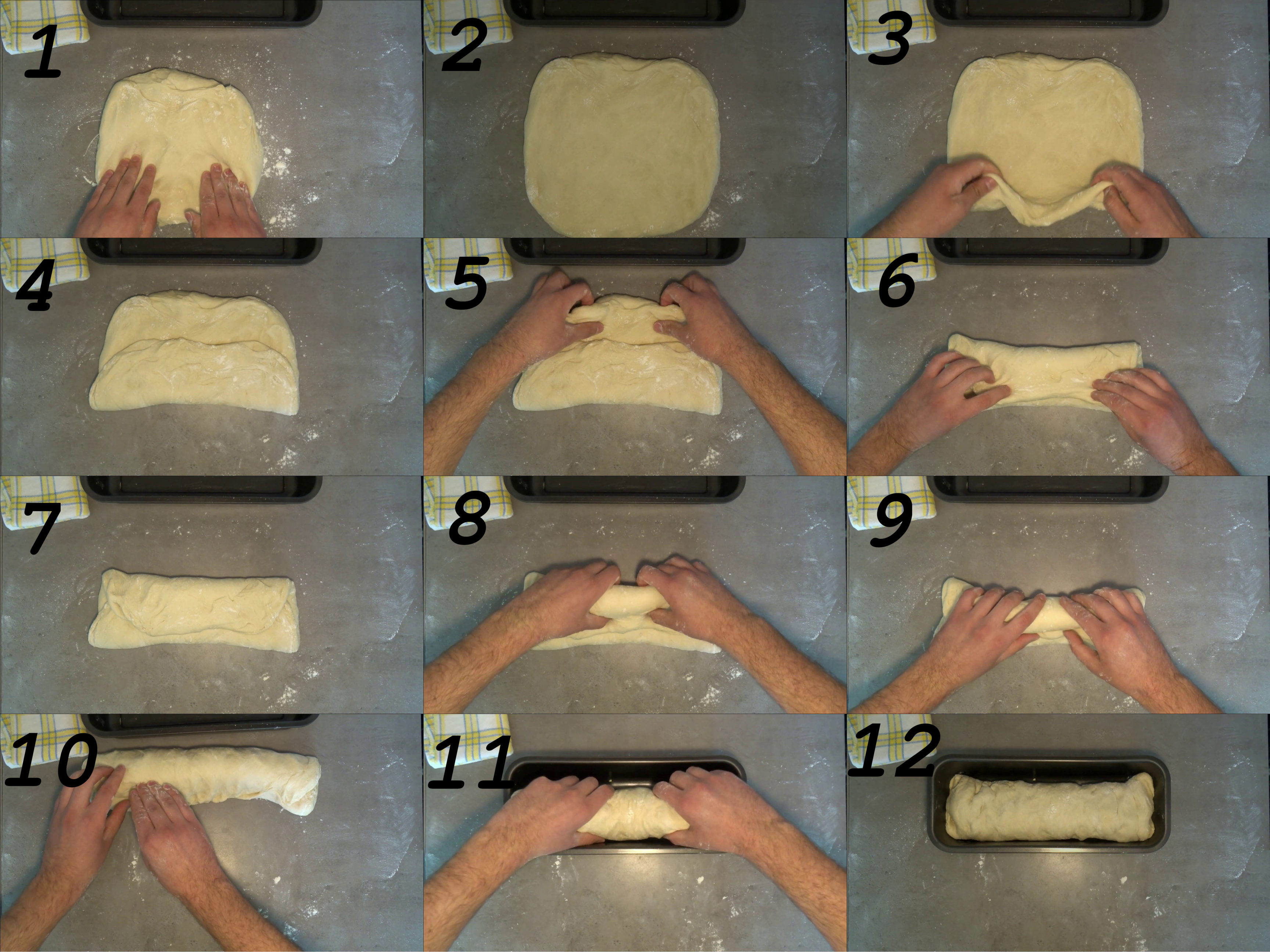 Vykynuté těsto vyklopíme na lehce pomoučenou pracovní plochu a prsty vytvoříme placku, která nebude širší než forma na chléb. Následně chléb přeložíme na třetiny a v závěru ještě na polovinu, vzniklý šev řádně zacelíme. Bochánek ve tvaru válečku vložíme do formy švem dolů. (viz obrázek pod textem nebo videorecept)